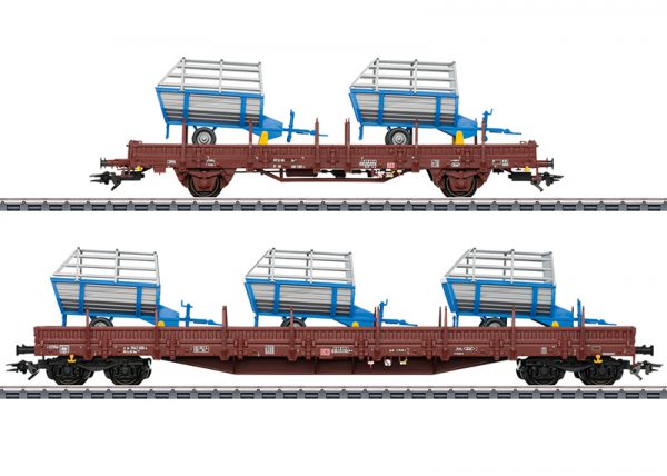 Vorbild: Zwei Rungenwagen unterschiedlicher Bauarten der Deutschen Bahn AG (DB AG). Beide Wagen mit Heuladewagen beladen. Betriebszustand ab 2007.